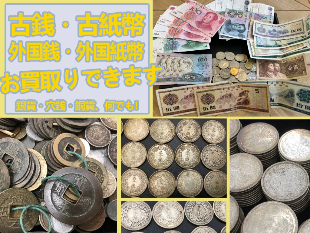 - 日本の古銭 1円銀貨や50銭銀貨などの銀貨、天保通宝や寛永通宝などの穴銭、古紙幣などなんでもお買取りいたします。 銀貨や天保通宝は「まとめて」ではなく一枚ごとに金額をお出しします。 ※銅貨やアルミ銭、古紙幣などはおまとめでの査定になることも多くございます
