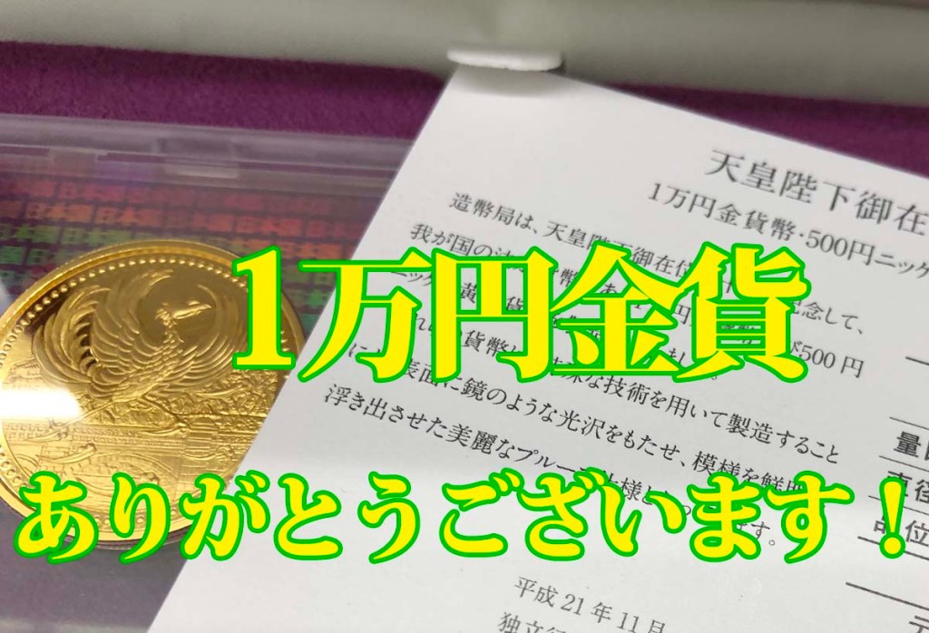 - 1万円の金貨は天皇陛下御在位20年記念や長野オリンピック冬季競技大会記念、2002FIFAワールドカップ記念 1万円金貨などたくさんの種類がございます。