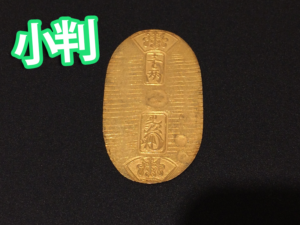 - 小判も種類は様々です。画像の小判は万延小判といい約57%が金でできている最も金の含有率が低い小判です。