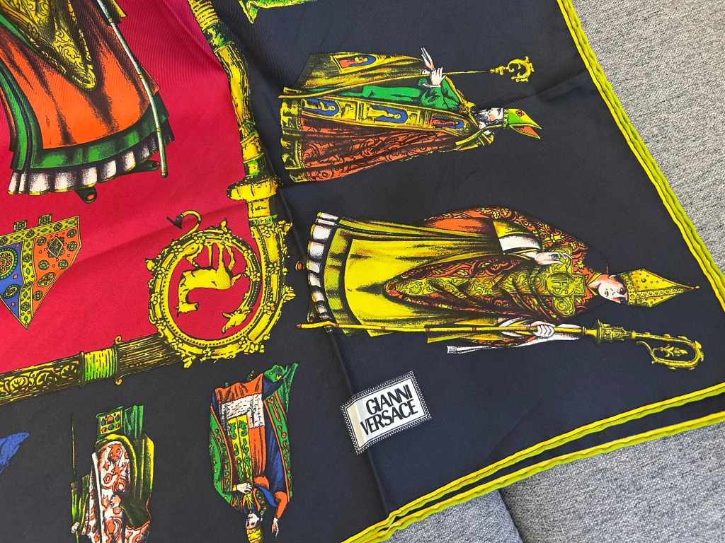- 写真のスカーフはジャンニ ヴェルサーチのシルクスカーフです。エルメスのスカーフのお持ち込みが特に多いですがエルメスだけではなくどんなブランドのスカーフでも査定いたします。