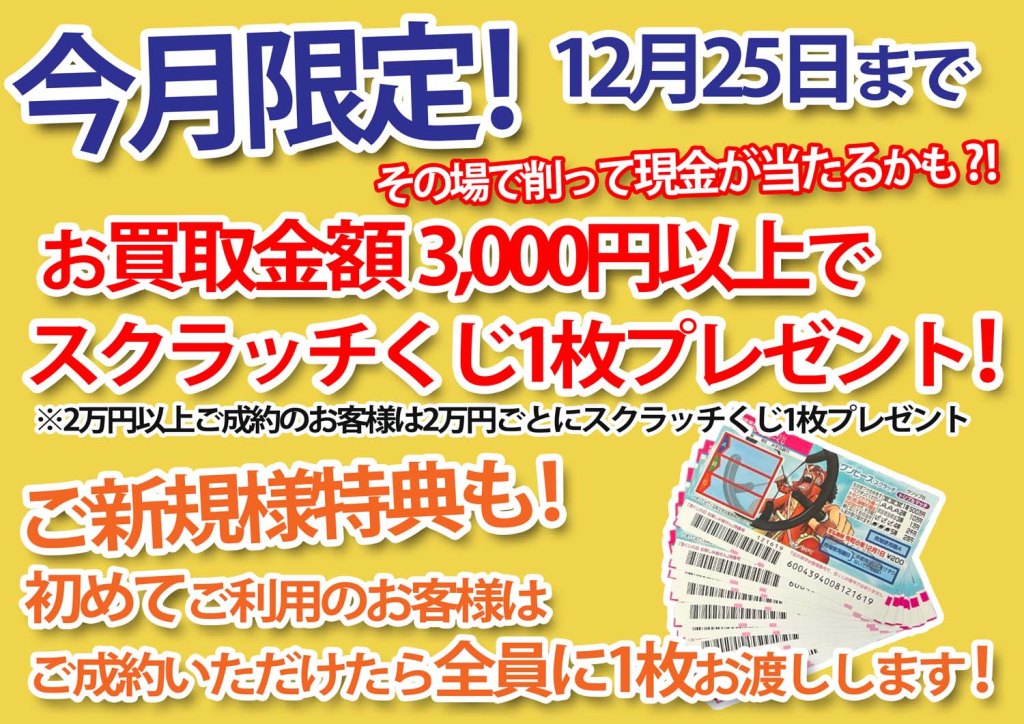 お買取金額3,000円以上でスクラッチくじ1枚削れます。