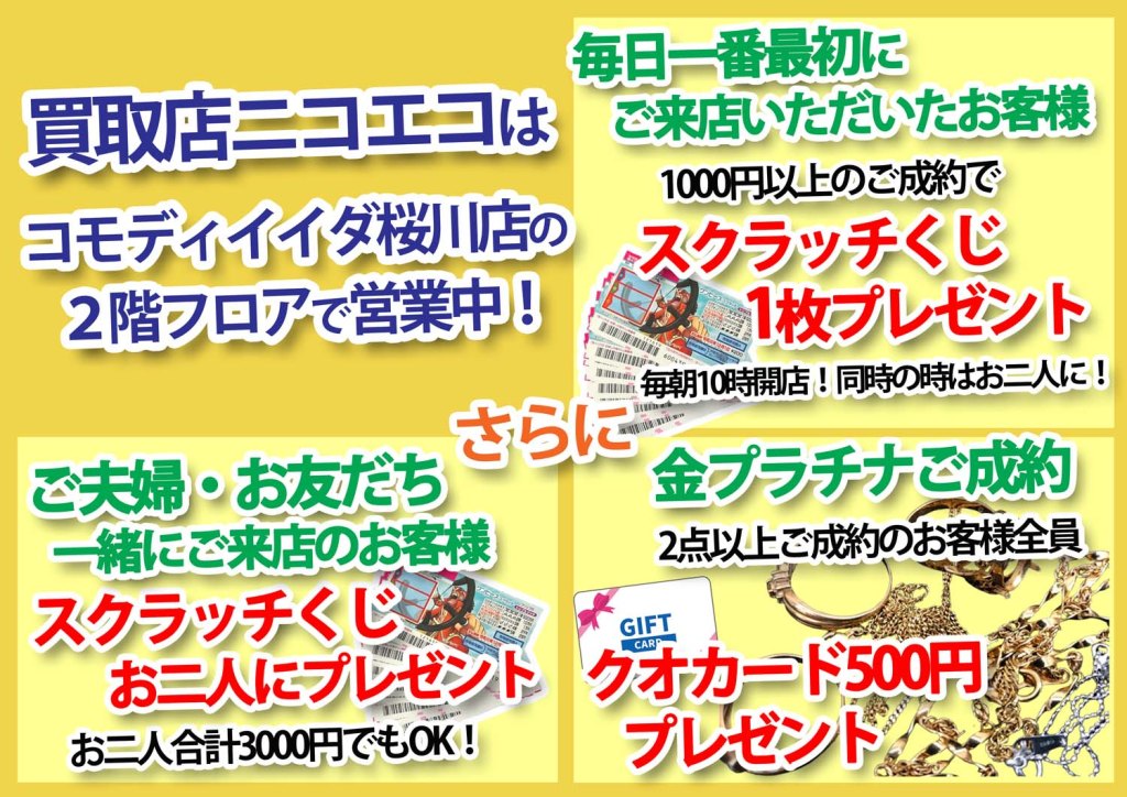 買取店ニコエコを初めてご利用されるお客様はご成約いただけたら「全員に必ず」スクラッチくじを1枚プレゼントいたします。