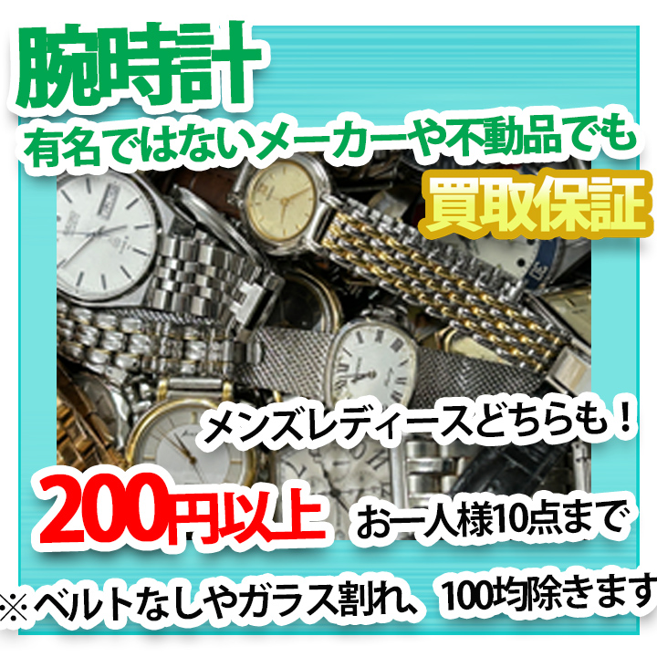 ベルトがない腕時計やガラスが割れている物、針などのパーツがついていない物、100円ショップで購入したお品物などは対象外とさせていただきます。 (お店側での判断とさせていただきますので予めご了承くださいませ)
