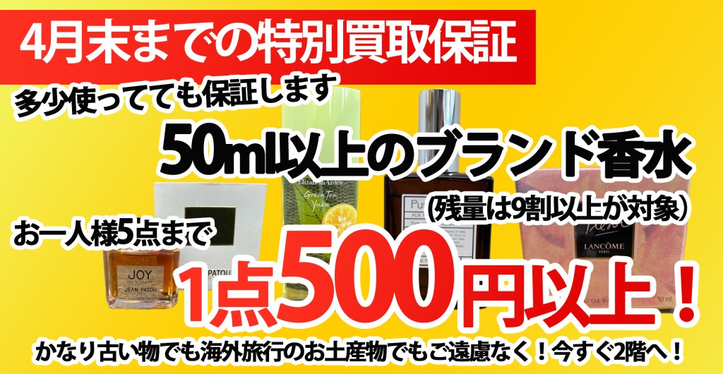 4月30日までの期間限定で、50ml以上のブランド香水を、1点500円以上で買取保証いたします!(※残量9割以上、容器に破損がない品限定)