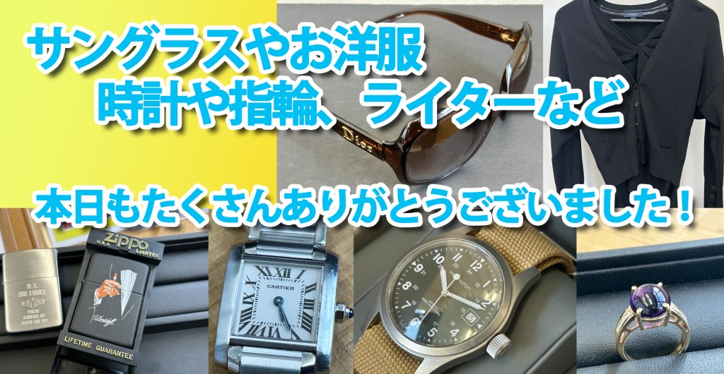本日はサングラスやお洋服、腕時計や金の指輪やライターなどなどいろいろなジャンルのお品物をお買取りいたしました!